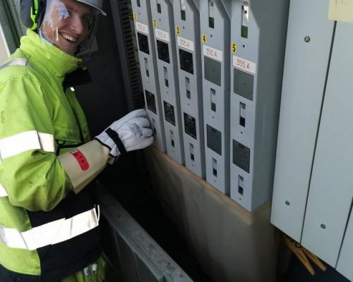 Her ser vi Jonathan etablere barrierer for å koble til en ny kabel i ei spenninssatt tavle. Vernetøy, hjelm m/visir, isolerende hansker og isolerende duk. Tydelig at du går en god skole – det er slik vi vil at ting gjøres i Laugstol!