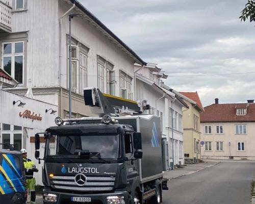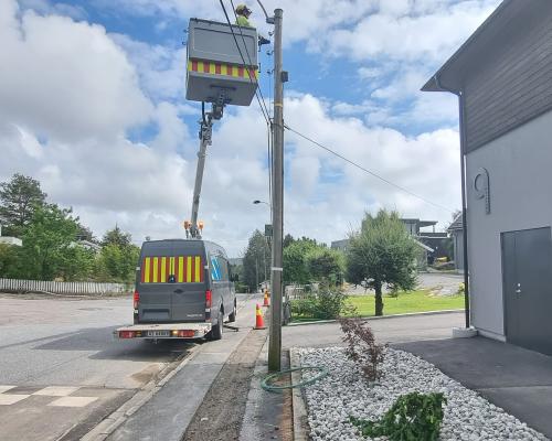 Laugstol monterer nye LED armaturer i Sverresgate, Porsgrunn.