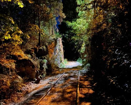 Det er moro å se hvordan ivrige ildsjeler har jobbet frem en flott tursti på deler av den 120 år gamle jernbanestrekningen Tønsberg-Eidsfosbanen – med lys skapes magiske øyeblikk og motiv.